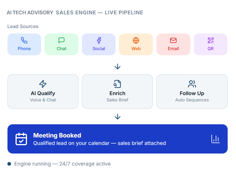 Capture every lead, qualify instantly with AI voice & chat, enrich with deep research, and book meetings on autopilot. Built for founders, sales teams, and business owners who refuse to lose another deal.